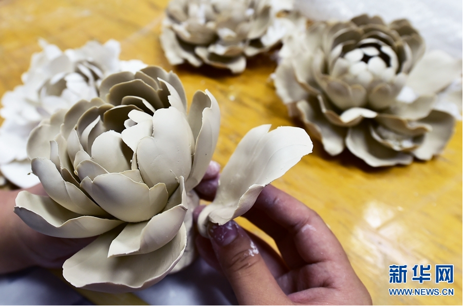 在洛陽(yáng)大唐李治國(guó)牡丹瓷制作車間,工人采用高嶺土為原料,用手工捏制出花瓣、花蕊、花骨朵、根、莖、葉等形狀,胚體經(jīng)過(guò)素?zé)⑹┯?、釉燒、著色、煅燒等多道工序后。栩栩如生、雍容華貴的牡丹,便“綻放”在瓷器上,再現(xiàn)了牡丹之形態(tài)、神韻、色彩的寓意。